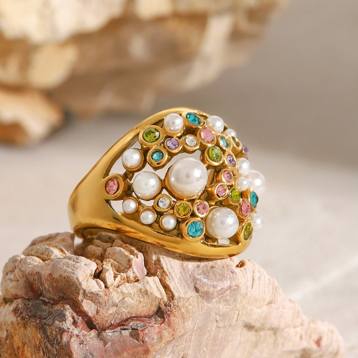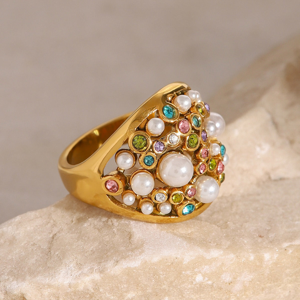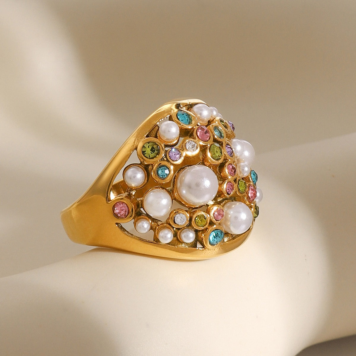 18K Gold Classic Retro Inlaid Pearl and Diamond Design Ring