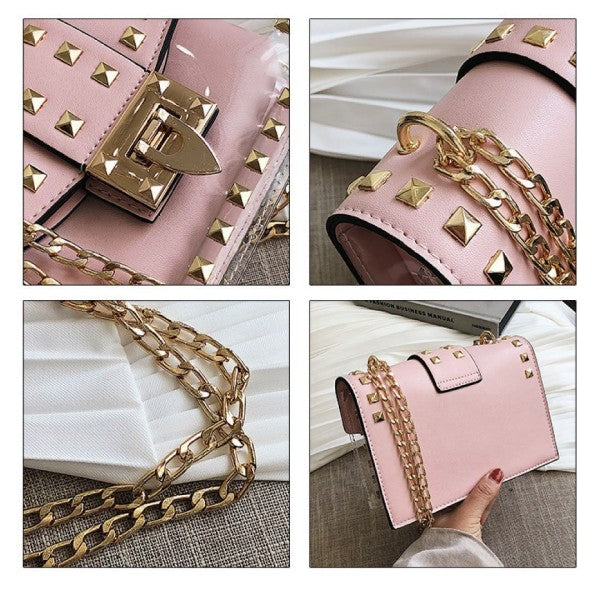 Gold studs delineate this fun, semi see-through bag. Clear on the front but comes with a removable pouch, in the same color of the bag, roomy enough to fit your essentials.