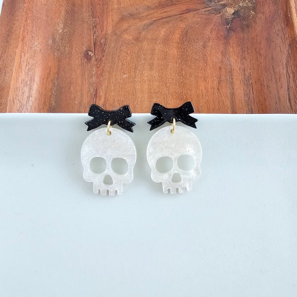 Get ready to show off your spooky side with our new Bow Skeleton Earrings. These whimsical dangles feature an adorable skeleton design topped with a chic bow, all crafted from a lightweight and durable shimmer acrylic. They're a fun and festive way to add a playful touch to your Halloween style, and they'll sway with a subtle sparkle as you move.