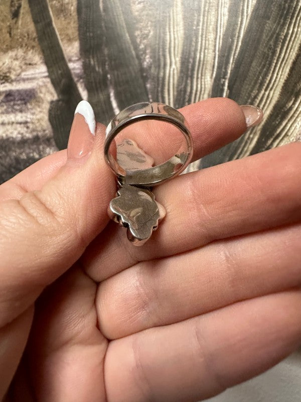 Gorgeous Handmade Fire Opal And Sterling Silver ring. Adjustable in size to wear on any finger. Beautiful stones. Beautiful details. Really great Ring. Measuring 1 3/8 inches long and 1/2 inch wide . Signed Nizhoni and stamped Sterling.