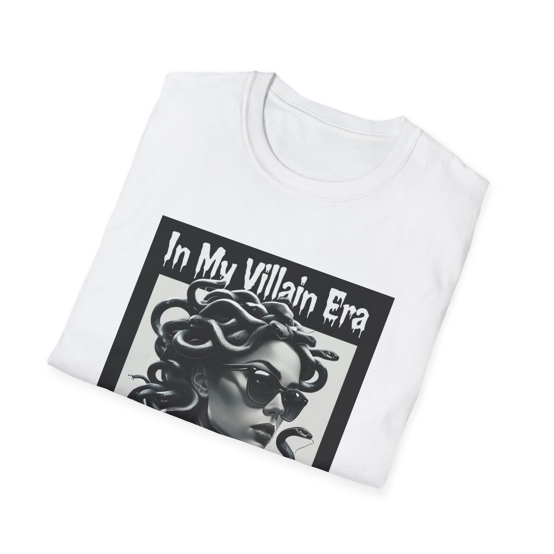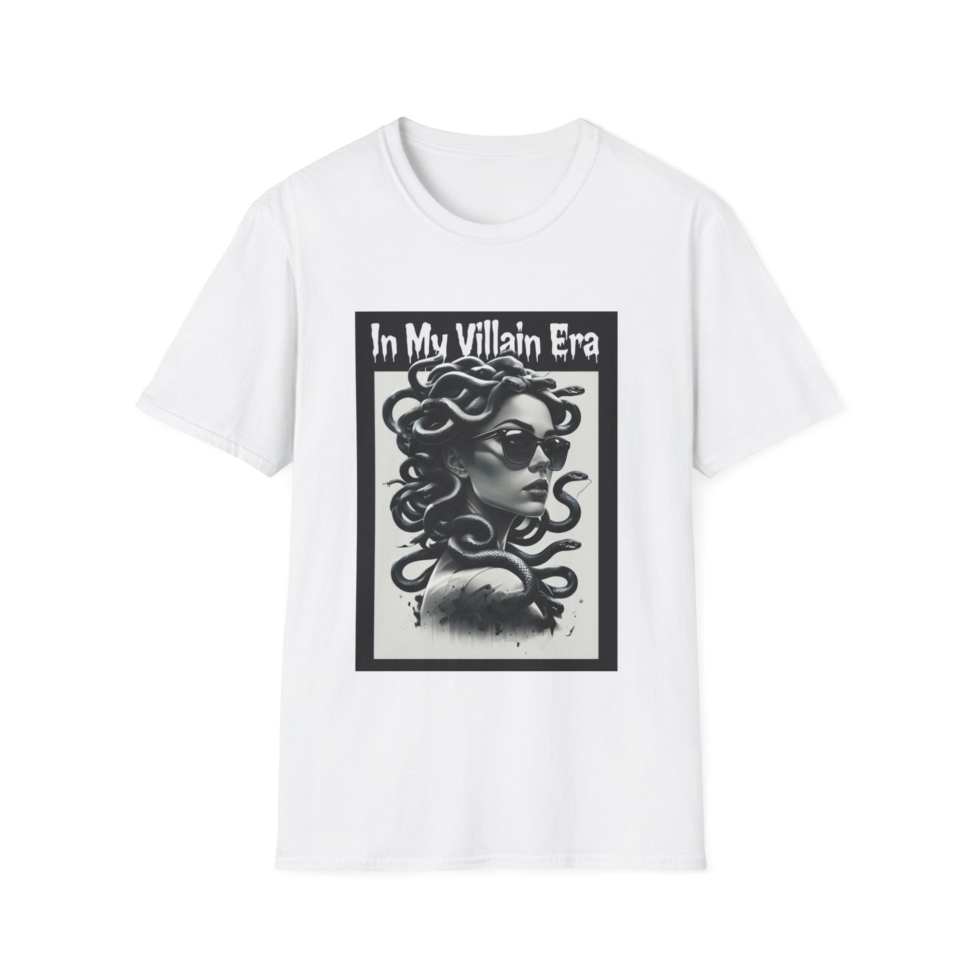 A modern Medusa villain design adorns this T-shirt, giving off a trendy and edgy vibe. Perfect for fans of Greek mythology or those who appreciate unique and bold graphic tees. Ideal for casual wear or as a statement piece for special occasions like themed parties or Halloween.
