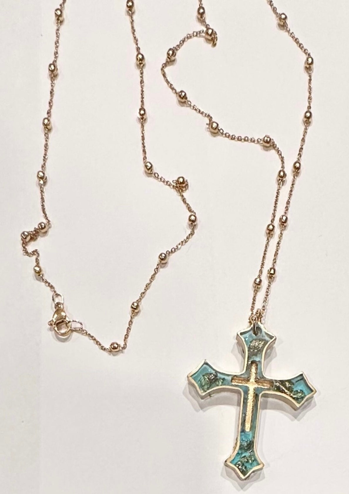 New. Resin cross. With gold leaf flakes inside and around edges. Cutout gold leaf center. Stainless steel. Gold plated. Satellite chain. 18in.