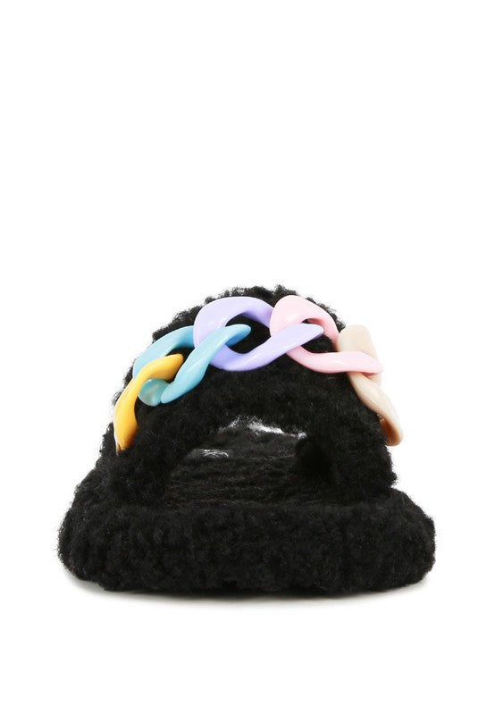 A pair of very fashionable slides with faux fur & acrylic chain on the strap. These slides comes with a very grippy outsole Multiple color's to choose from.
