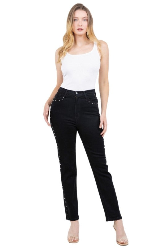 Elevate your everyday style with our Essential High-Waisted Mom Jeans, designed with a flattering 12-inch rise for a classic silhouette that hugs your curves in all the right places. Hand pressed studs. Crafted in the USA using premium, durable fabrics, these jeans offer a soft yet structured feel that ensures long-lasting comfort and a perfect fit. The tapered leg and timeless black wash make them a versatile wardrobe staple-effortlessly styled up or down. Whether paired with sneakers or heels, these jeans are your go-to for confident, casual cool.
