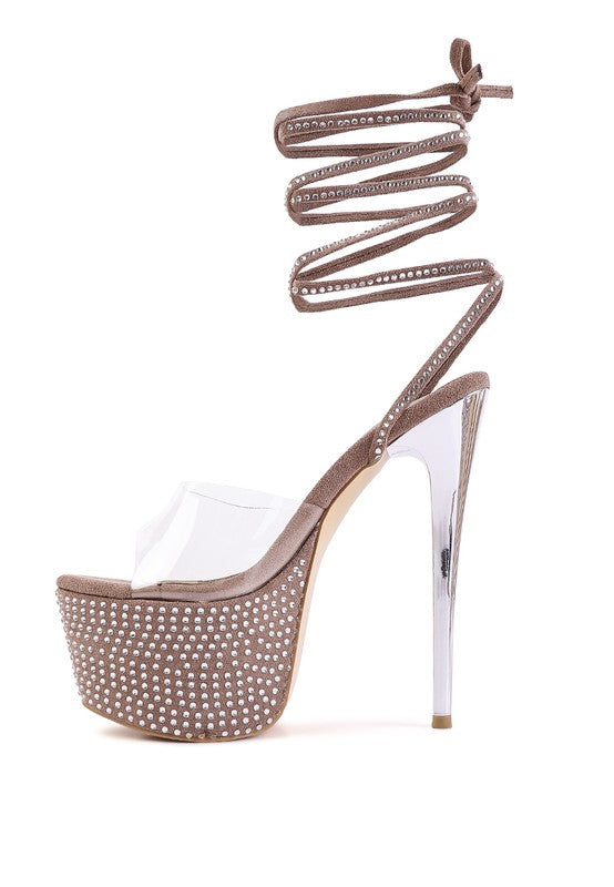 Centre of attraction guaranteed in these stunning and racy platform heels. The strappy detail is sexy, while the diamante adorning the strap and the wedge is alluring. The strap is clear and hence the focus is completely on the heels.